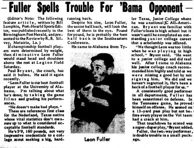 Coach Bear Bryant is quoted in this article, "Leon Fuller is our best football player at the University of Alabama!" Hear Leon talk about his years at the University of Alabama on Down Trails of Victory podcast!