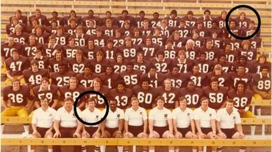 Leon Fuller was an assistant coach at the University of Wyoming when Nederland native Don Clayton was its QB. The Cowboys finished as WAC co-champs, and played Oklahoma in the Fiesta Bowl. Head coach of the team was future University of Texas head coach Fred Akers. Hear Leon talk about recruiting Don Clayton right here on Down Trails of Victory podcast! (circled--Leon Fuller and Don Clayton)